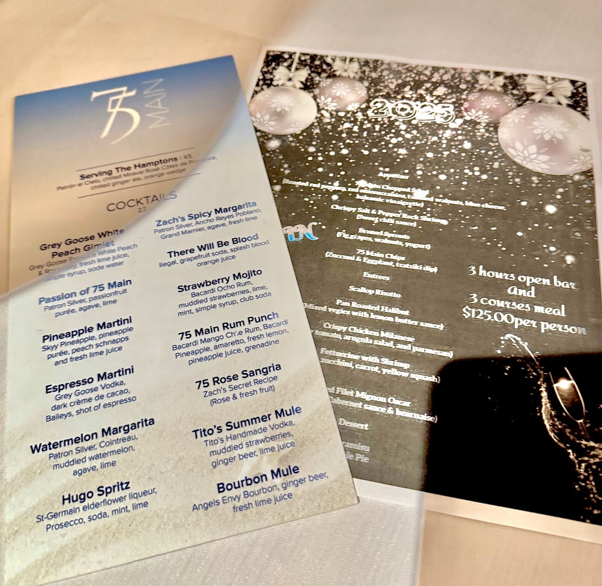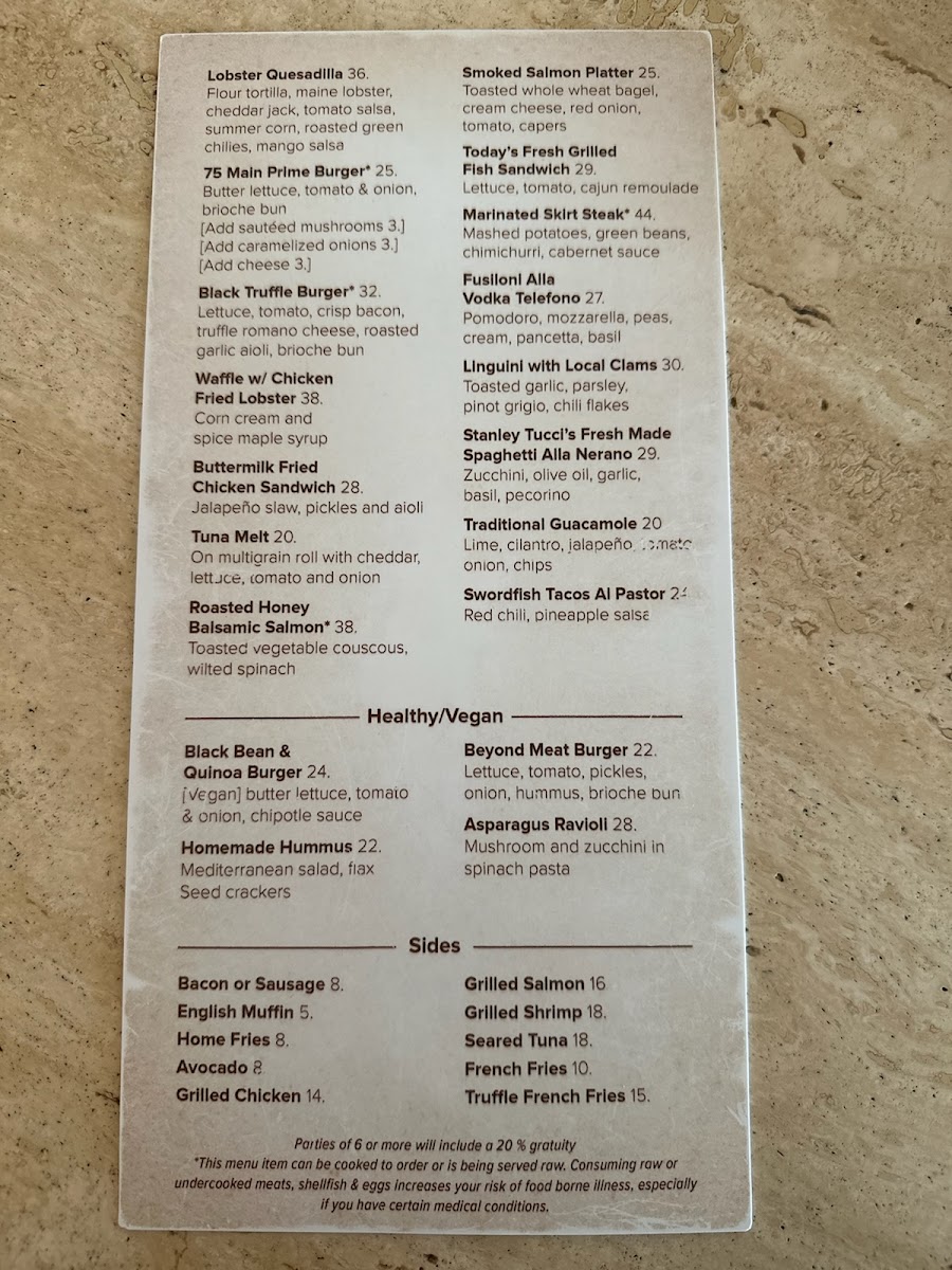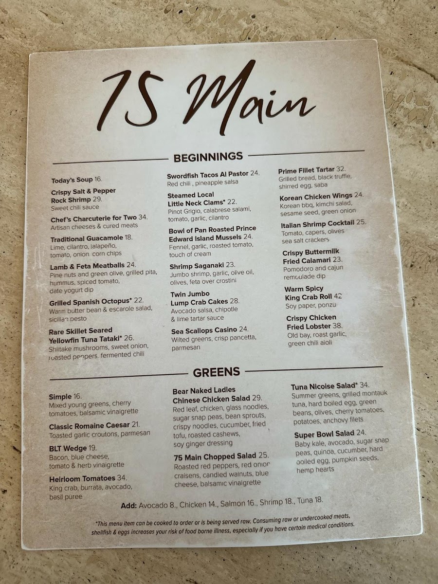 75 Main in Southampton offers a vibrant blend of American, Italian, and seafood cuisine, with thoughtful vegan options that cater to diverse palates. The menu shines with comforting classics like Chicken Parmesan and fresh seafood selections, alongside standout sides such as truffle fries, sautéed broccoli, and baby bok choy. For younger guests, the kids' menu is filled with familiar favorites like mac & cheese, grilled cheese with fries, and chicken fingers, making it family-friendly.