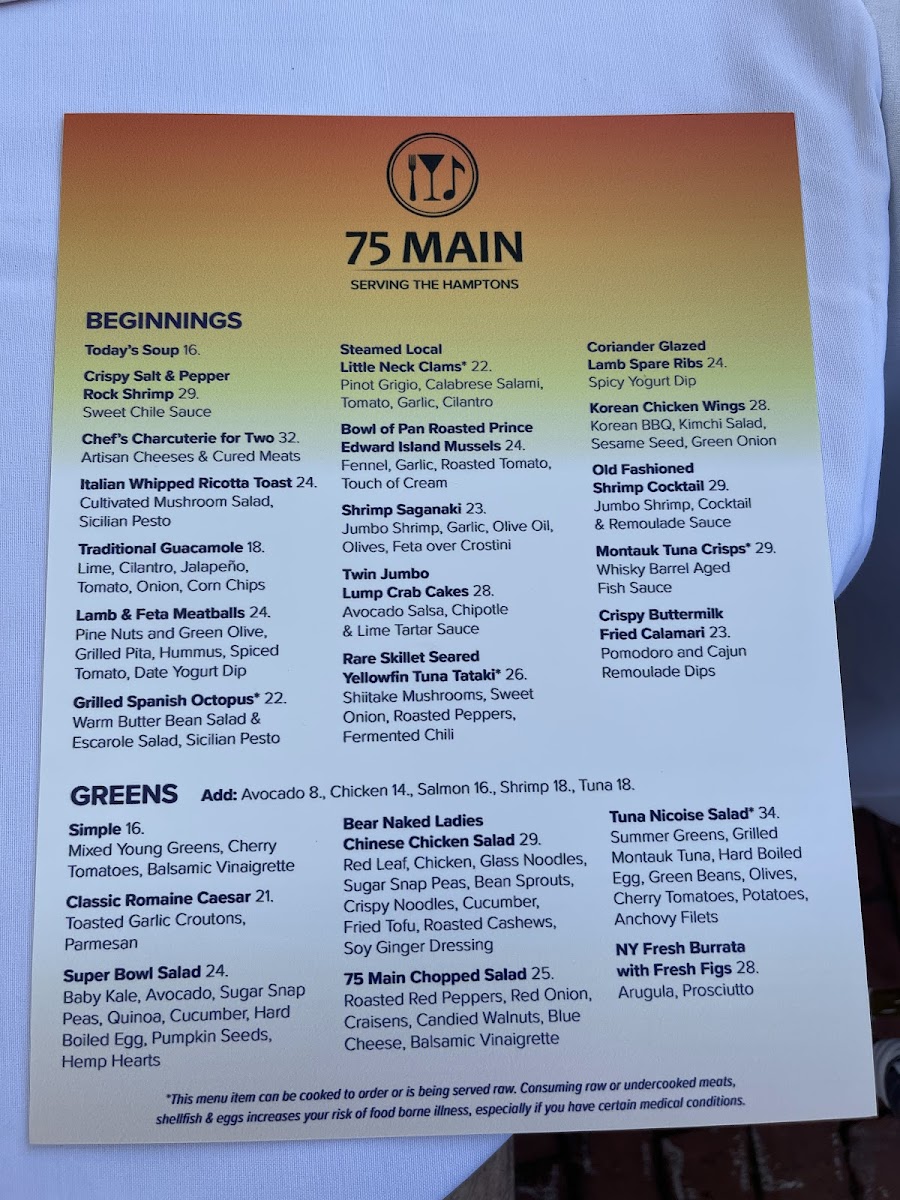 The dishes feel authentic, with highlights including crispy Brussels sprouts, crab cakes, and avocado-focused options praised for their freshness and flavor. The carefully curated sides elevate the experience without overwhelming the main courses, emphasizing a balanced approach. While service has received mixed reviews regarding warmth, the quality and creativity of the food create a welcoming culinary destination in the Hamptons. Whether dining indoors or enjoying the lively outdoor seating, 75 Main captures a dynamic yet approachable dining vibe worth exploring.